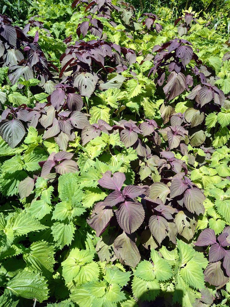 今日のお花のシソ、畑の一画にこぼれ種から生えた赤紫蘇と青紫蘇が入り混じっています🤗