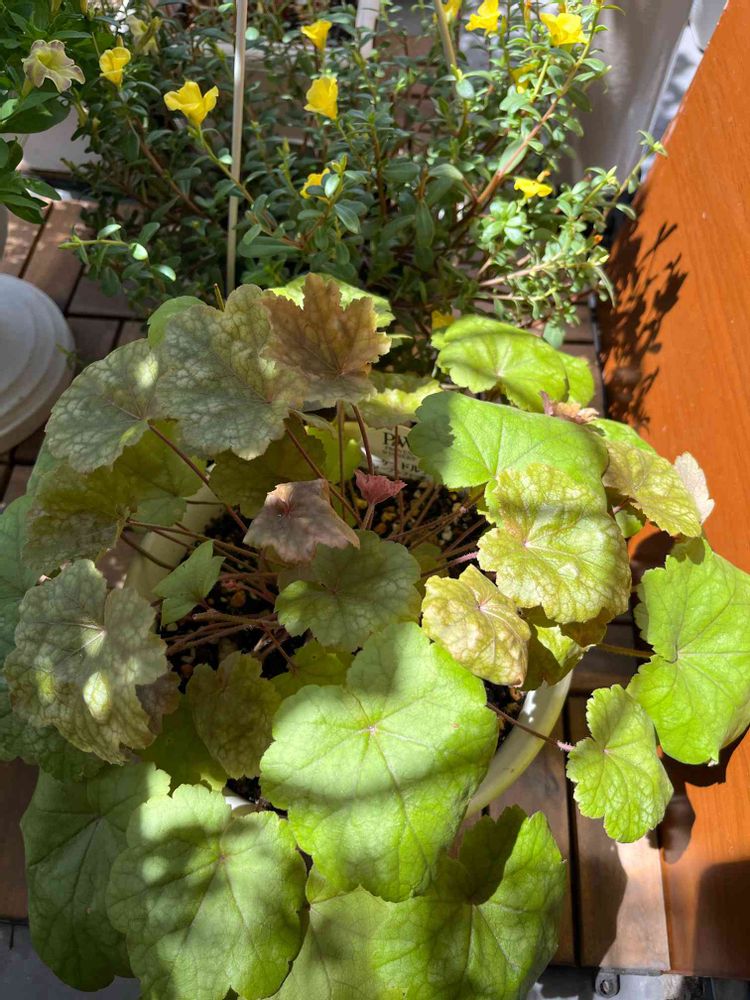 西のベランダで、PWヒューケラドルチェが元気に育ってます😊すだれで日陰を作って、置いています🎶