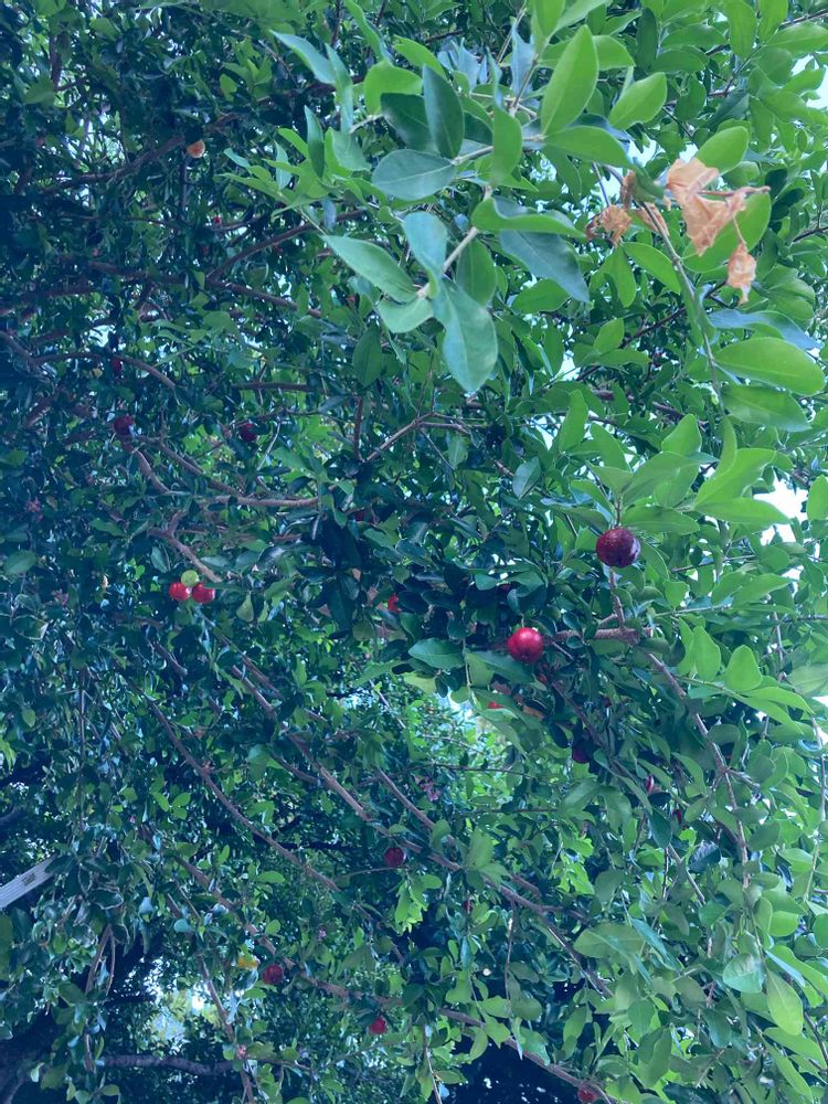 アセロラの実です🍒小さな5弁のピンクの花もかわいいです🌸ビタミンCがレモンの34倍含まれていてポリフェノールも豊富だそうです🥰7/9早朝@那覇市🤳