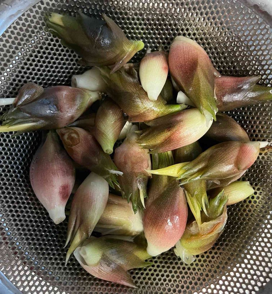 夕方の水やりしていたら、茗荷の花が茎の根元に見えたのでついつい素手で収穫してしまいました。