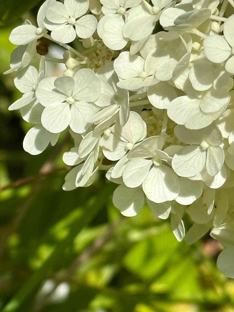 Hydrangea paniculata/Hydrangea. Hydrangeaceae. Cornales. Magnoliopsida. Tracheophyta Commonly called/Panicle hydrangea Native to/China. Japan Naturalized/China. New Zealsnd. the Americas Spititual meaning/Gratitude. Grace. Beauty Symbolism/Unity. Togetherness *Mynth in Japan/An Emperor, who having angered a woman he loved deeply due to his neglect of her in favour of his work,gifted her with a bunch of hydrangeas as a symbol of his deep emotions and gratitude towords her. Photo 8/2 9:29am 2023