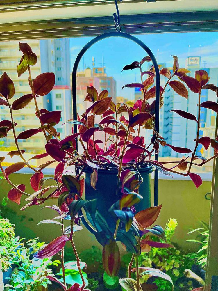 今、我が家で一番元気な「トラディスカンチア ゼブリナ」窓辺でハンギングにしています。赤紫の葉が美しい💜❤️ 今日も水分しっかりとってボチボチいきましょう🤗 We can do it!