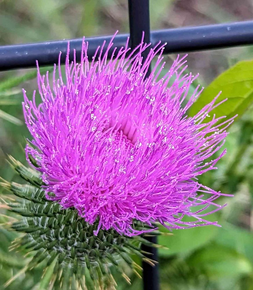 散歩道のフェンスからはみ出してる、可愛くて元気なアザミ💜
