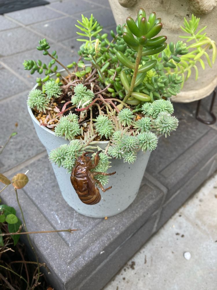 花屋さんで購入したセダムの寄せ植えにアブラゼミが💦