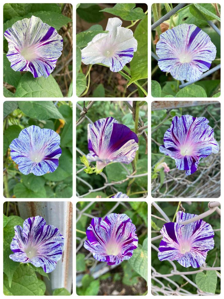 今日の早朝散歩で常磐線の柵に絡んで咲いていた朝顔たち。