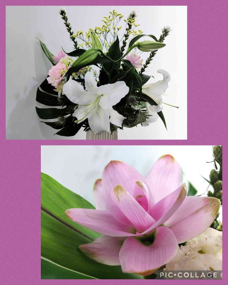 今週の花材は、クルクマ、ユリ、トルコキキョウ、エレンジューム、スターチス、リアトリス、ユリ、モンステラ、です✨👏