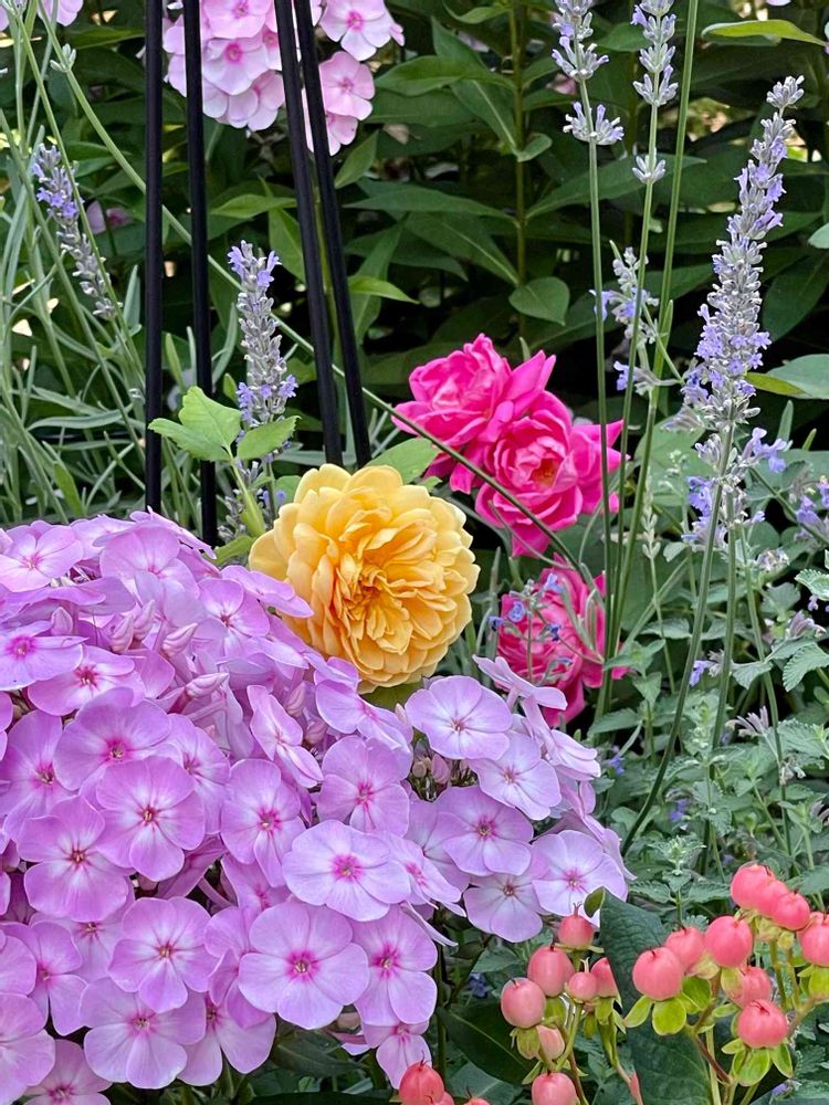 この角度から見たゴールデンセレブレーションとフロックス、ガーデンローズやキャットミント、ラベンダー、ヒペリカムの組み合わせ