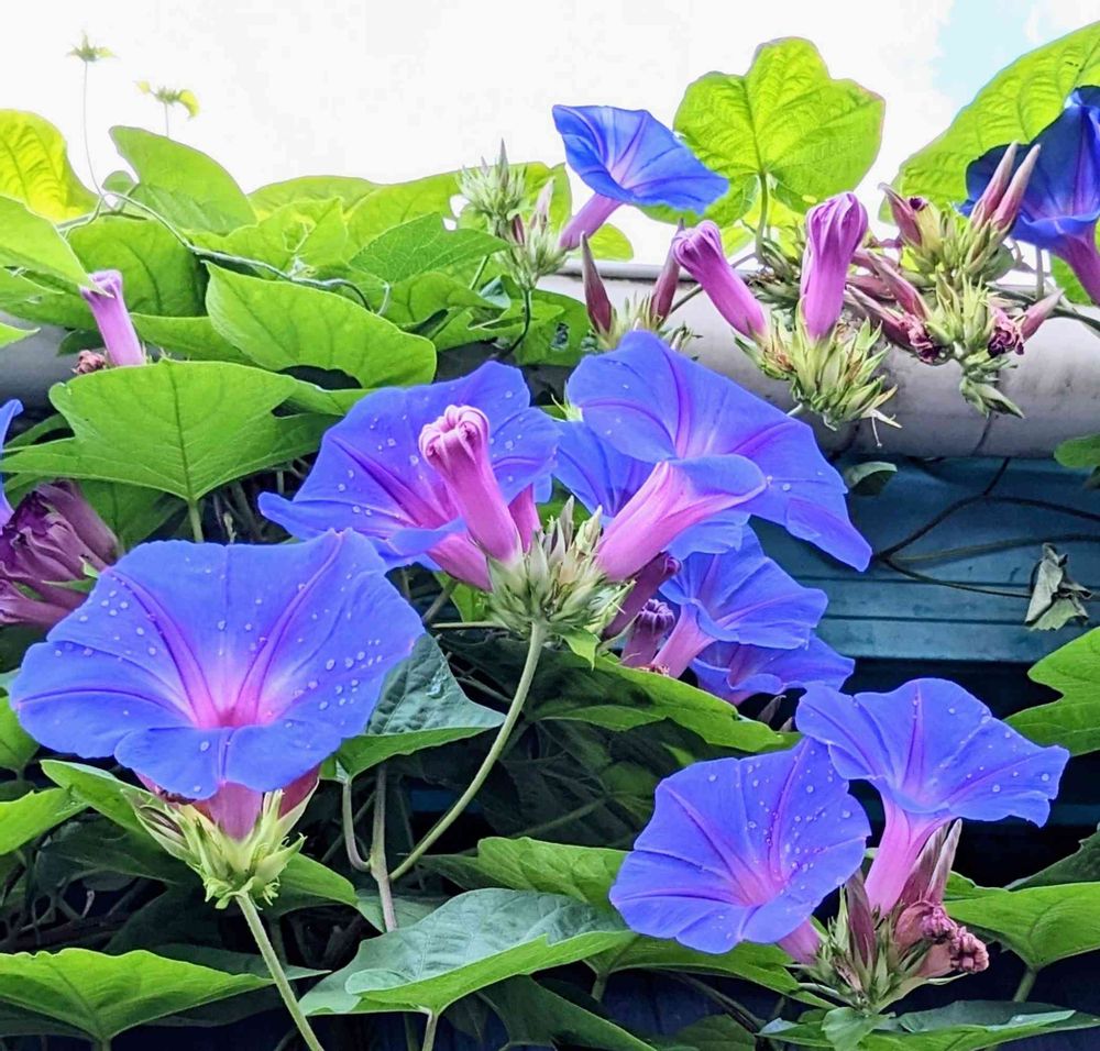 オーシャンブルー💙💜の朝顔がお店の壁を這うようにして咲いていました