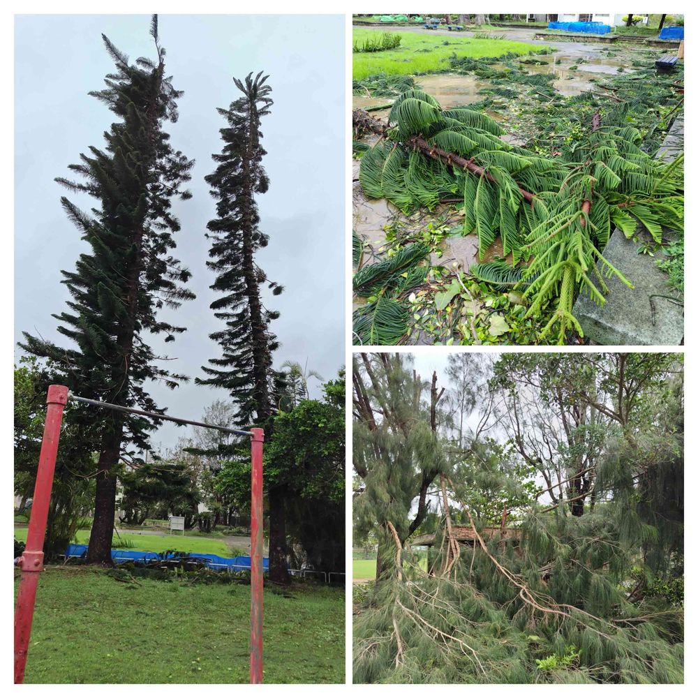 2022.11月にも投稿したナンヨウスギ、東からの暴風にて東側の枝が喪失。ヤシの木なんかも半分葉っぱ喪失したのが多数です。
