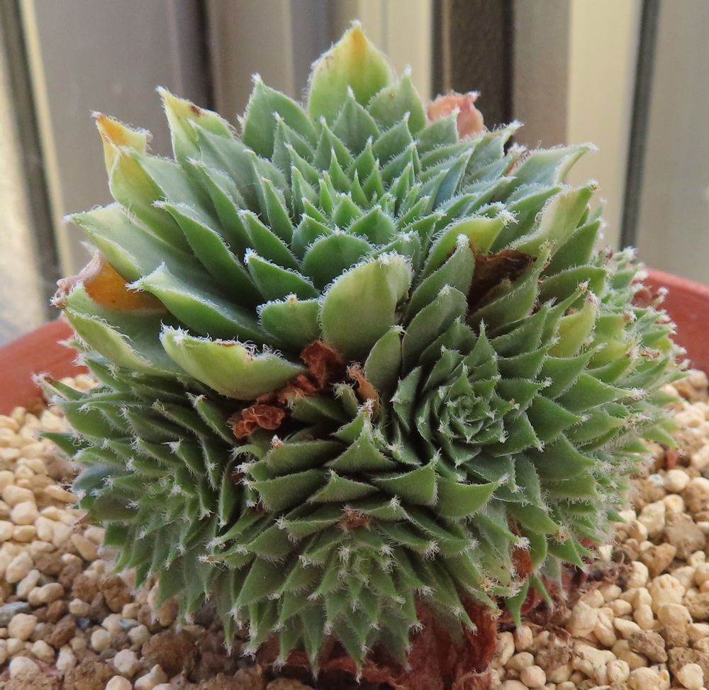 6月に一度投稿した子沢山のバニラシフォン。暑い時期にもかかわらず子株が少しずつ大きくなって,全体がほぼ球形になってきた。