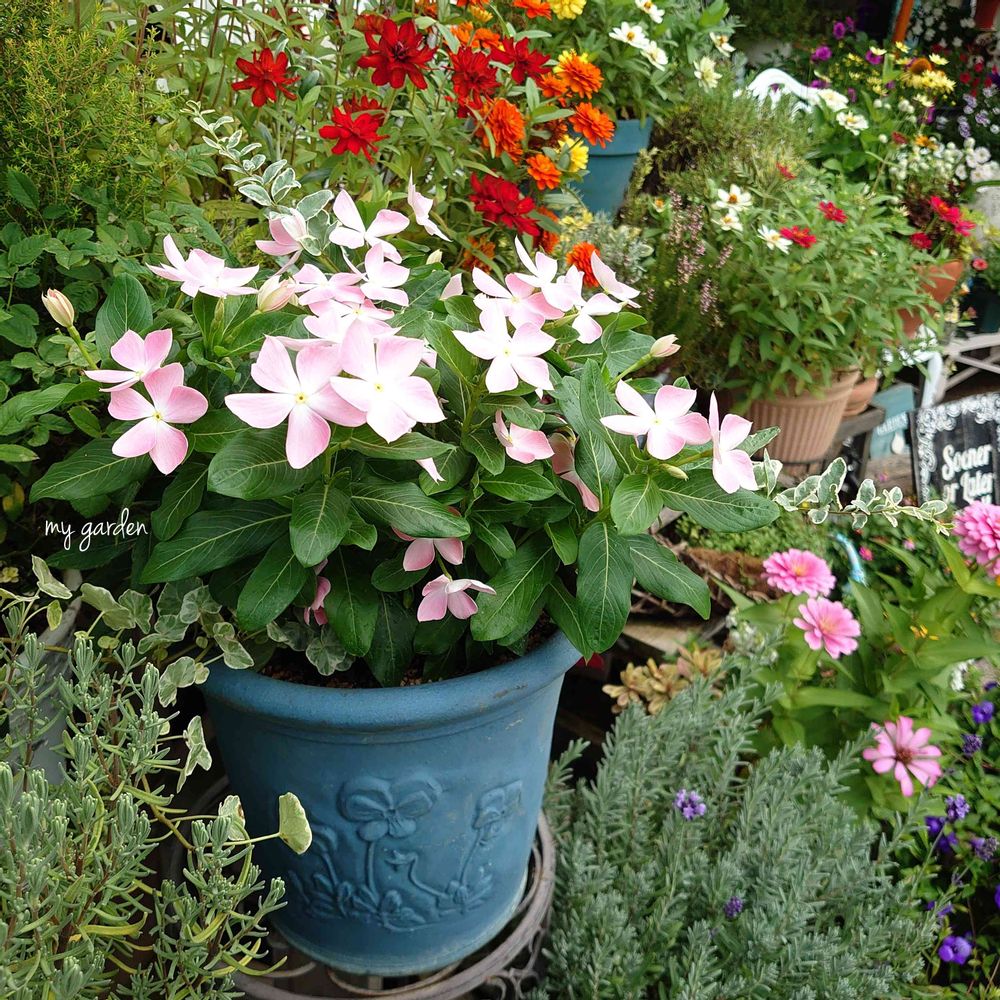 鉢増しも兼ねて寄せ植えにしました!ブルーのプランターにこのピンクがとても可愛いです☻
