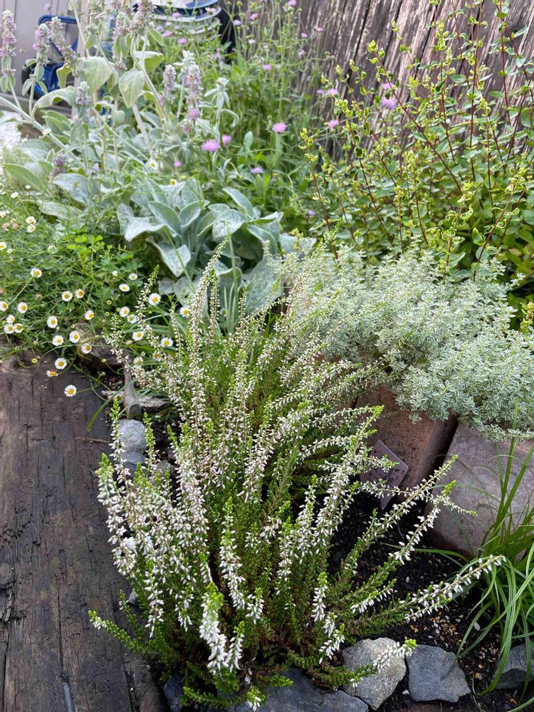 ラムズイヤーのシルバーリーフもシルバータイムもアベリアも。葉っぱが綺麗なので長く楽しめていいです。