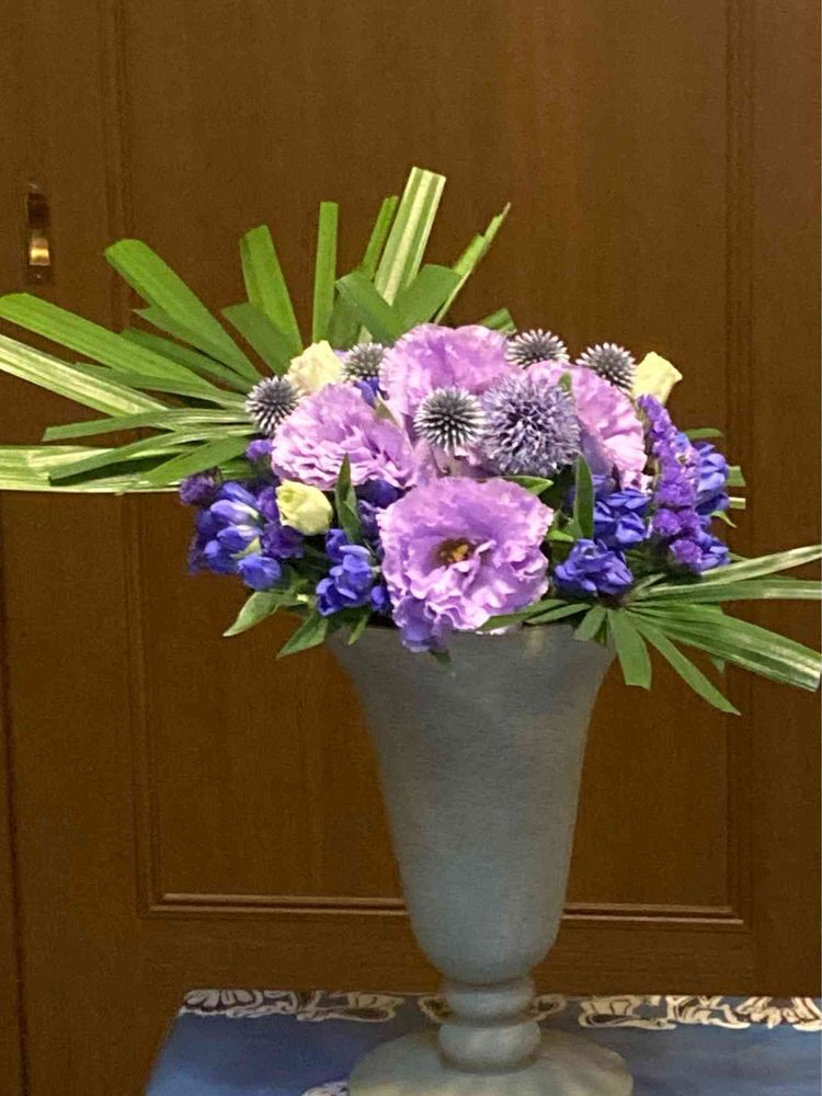 寒色系の花を選びました。猛暑なので日持ちがするようなるべく茎を短くしてアレンジ。