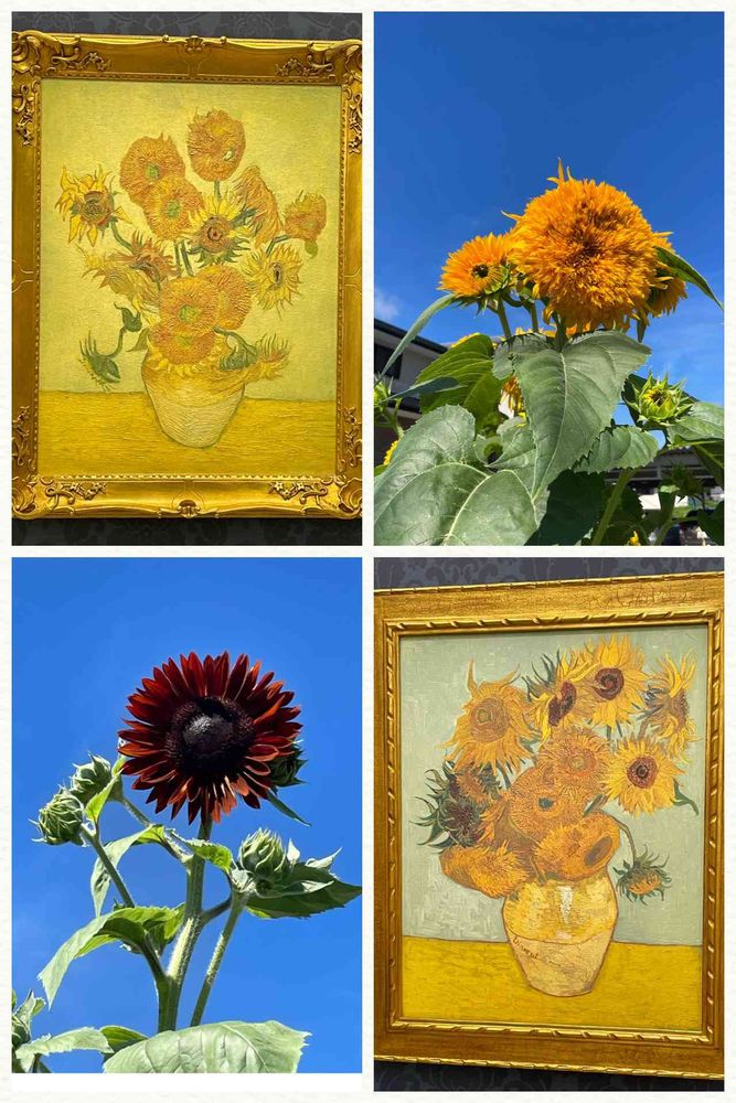 昨年、初めて姉妹で1泊旅行をした時のpic。「大塚国際美術館」のゴッホの「ひまわり」と宿の近くで見つけた「ひまわり」