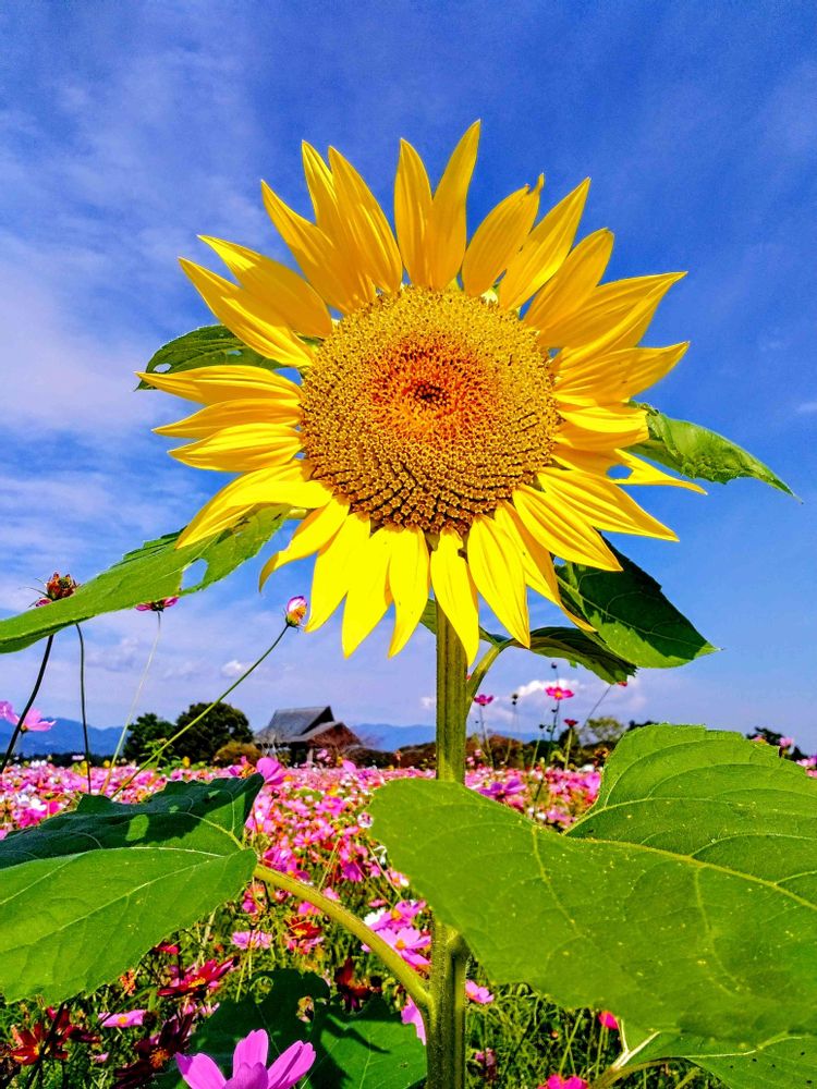 青空の下、見渡す限りのピンクのコスモスが咲き誇り、その中で金色に輝く向日葵が素晴らしいですね。