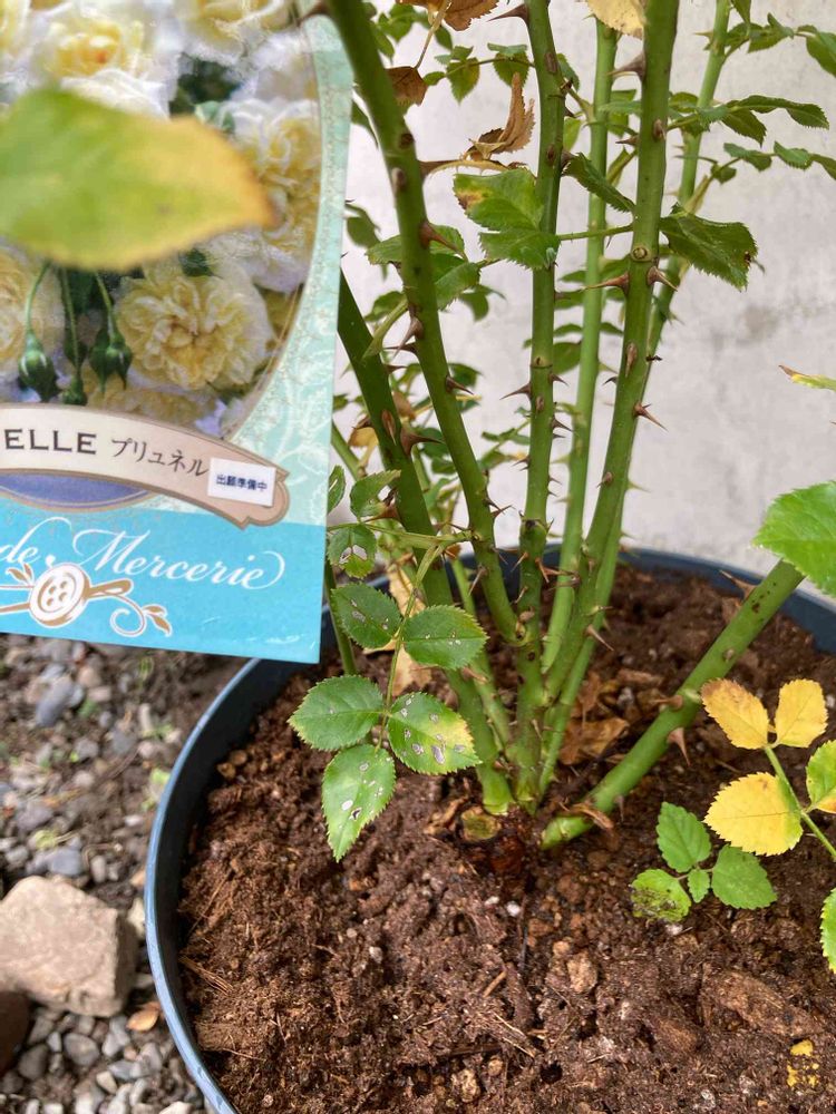 河本バラ園 河本麻記子さん作出 プリュネル 今年の春新苗でお迎えし、2度目の鉢増し。こんなに沢山ペイサルシュートが出てた!!