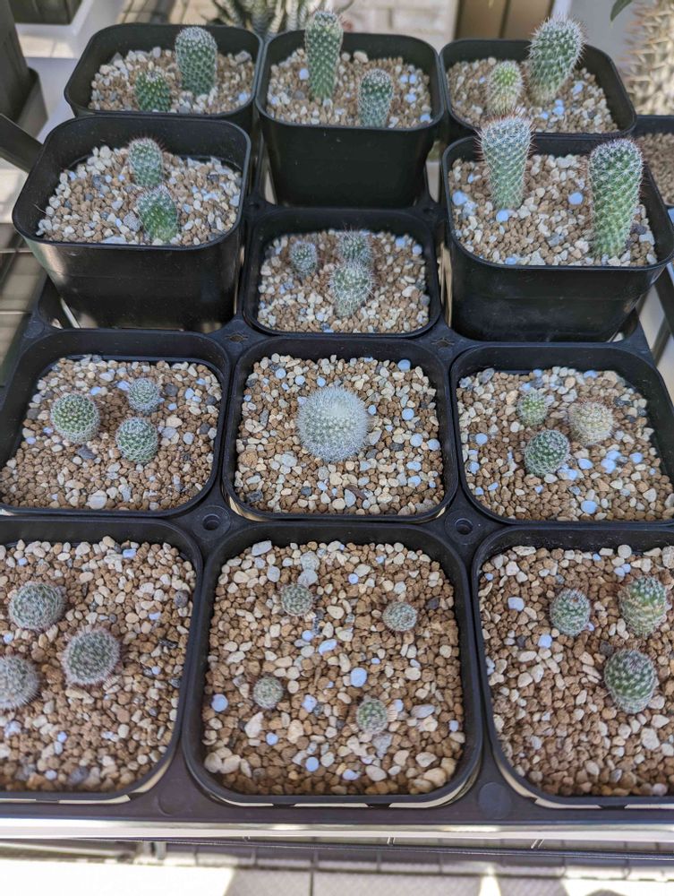 マミラリアの銀河の実生です。丸くならないですね。徒長している子がちらほら。