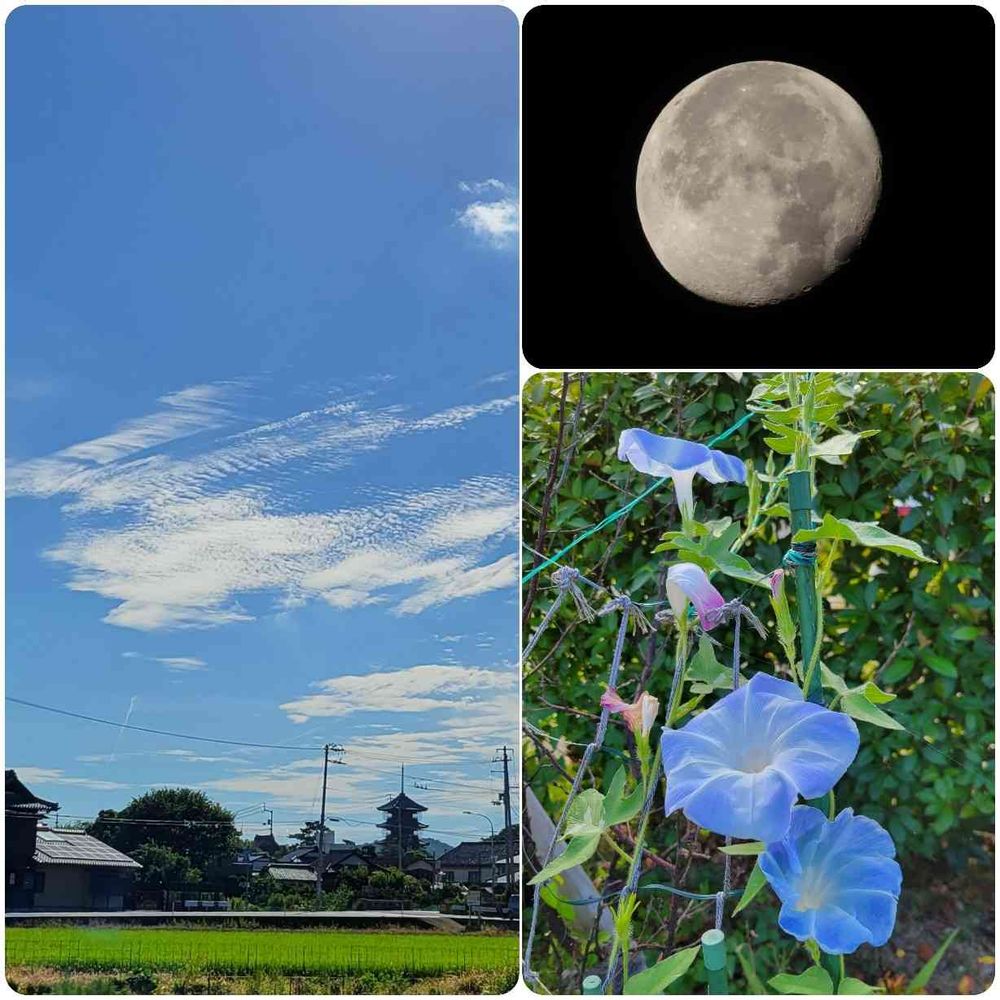 昨朝に見た空と月とお花に秋の気配を感じました。