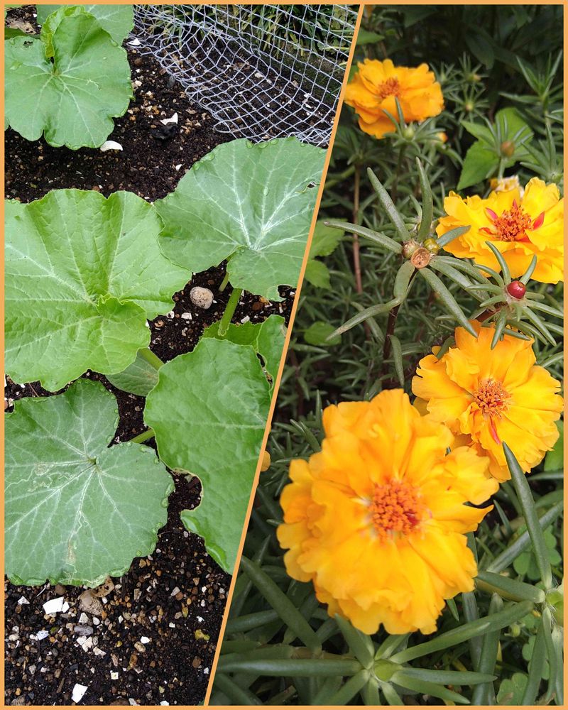 生ゴミの中から発芽したかぼちゃさん🎃本葉が4枚になりました🌱ネットに迄もう少しです😚頑張れ🎃🧡 マツバボタンさんも応援しています☺️😙🤭