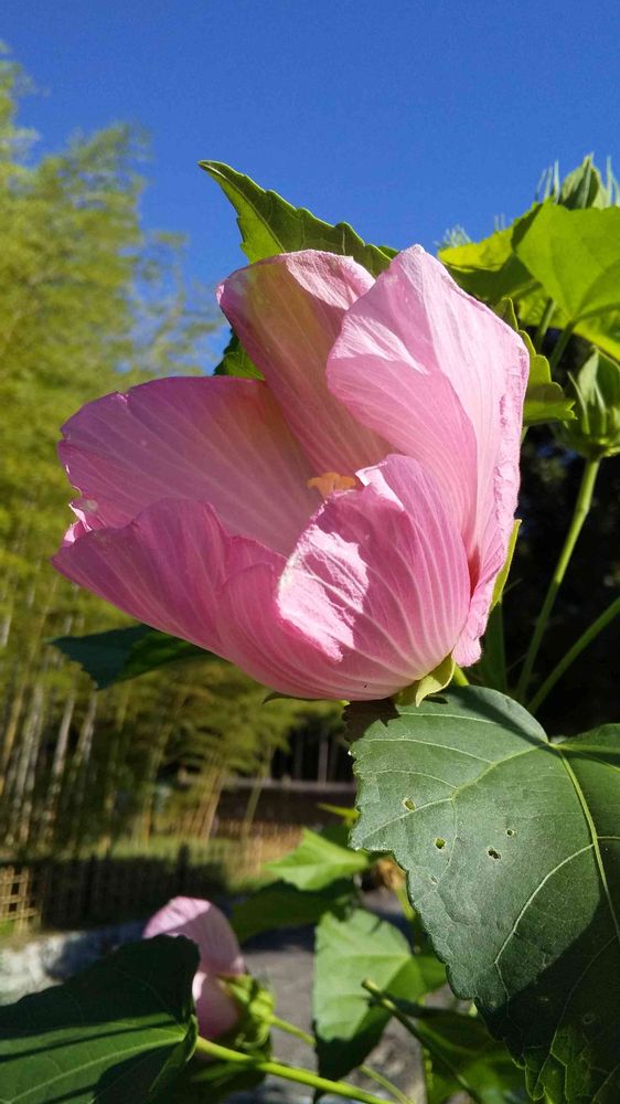 万博公園にて、青天のもとピンク色に輝く「フヨウ」をパチリ!📸💙🌺🌿