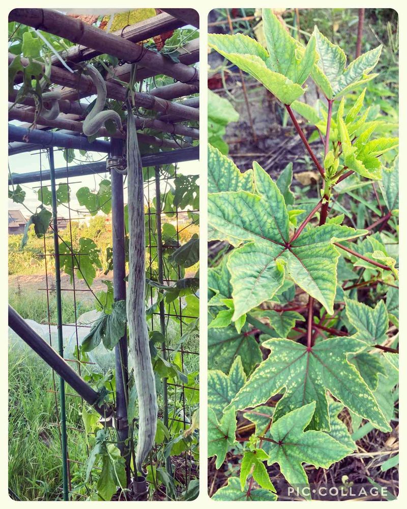 花友さんから種子を頂いたヘビ🐍瓜とローゼルです