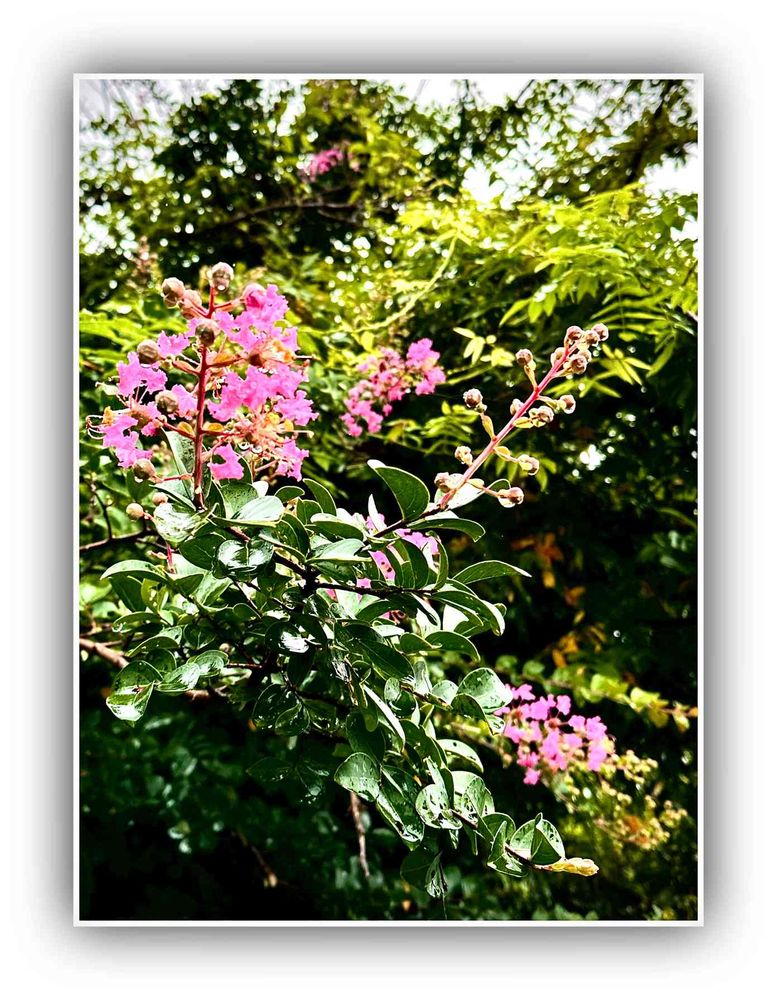訳意;The Crape myrtle flowers that started to bloom in full bloom after the rain are beautiful.