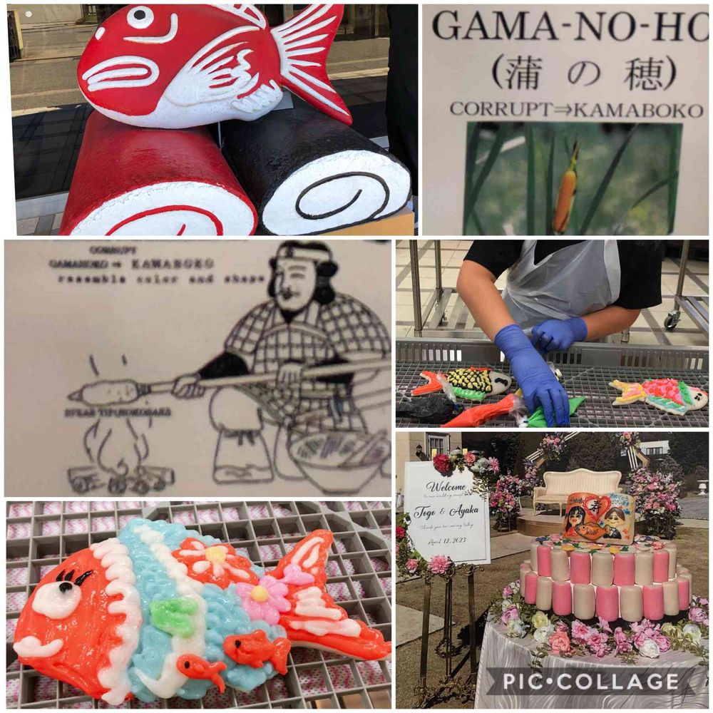 富山の結婚式に出た際の引き出物、お派手な蒲鉾にびっくりしました。お魚の蒲鉾、素敵に出来上がりました。ガマの穂ですか?