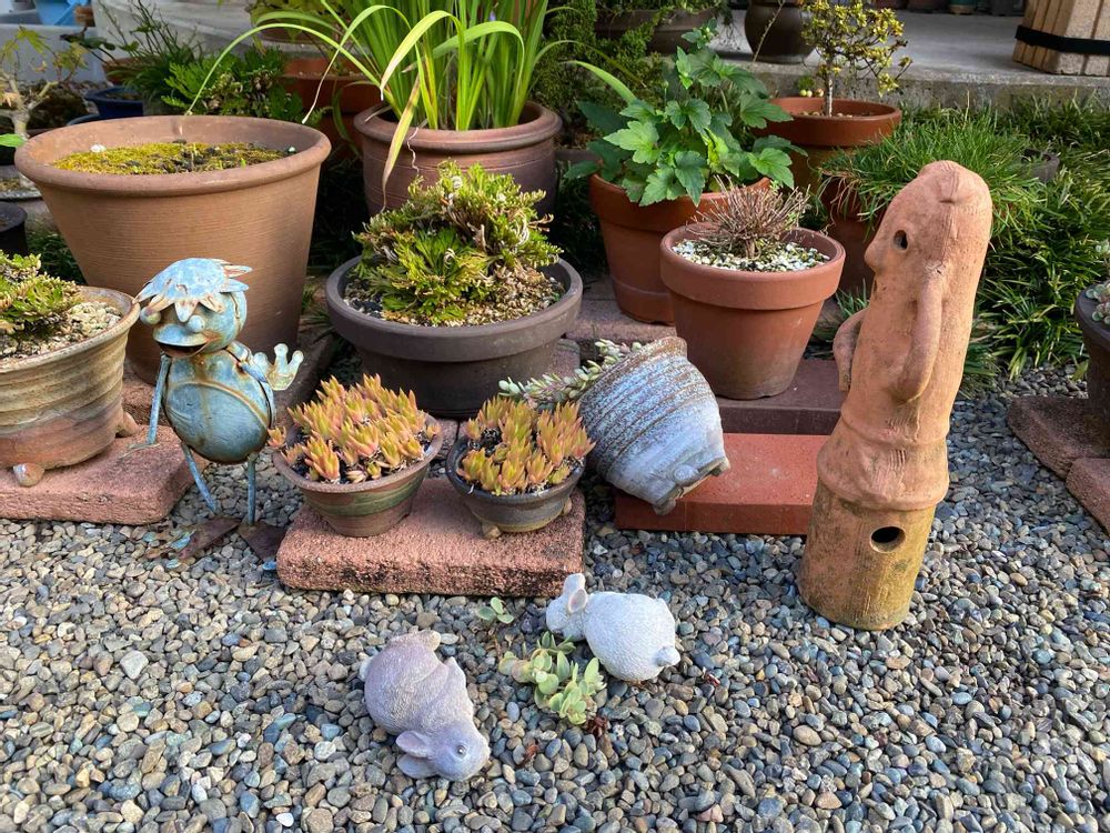 心配で花壇や鉢植えを見回したら…うわっ❗️ヒダカミセバヤの小さな鉢がひっくり返っていて、その手前では、実生のヒダカミセバヤを守っていたウサギカップルがノックアウト😱庭番サブのカッパ君は、やめて〜のポーズでフリーズしてます💦💦他に、イロハモミジの根洗いが、受け皿から飛び出していました💦