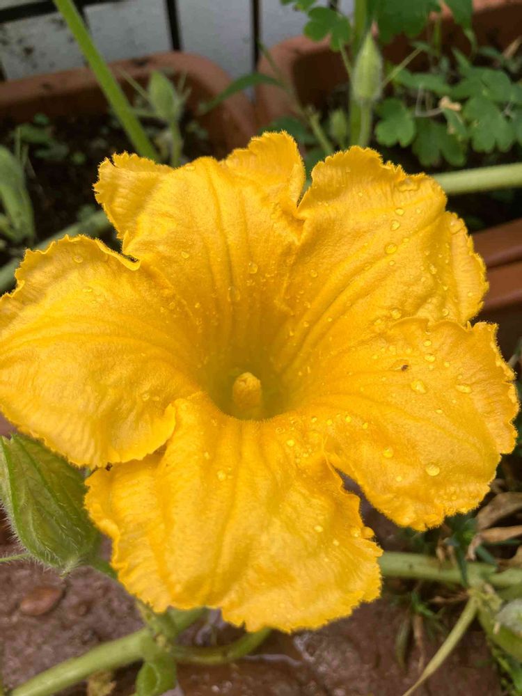 おはようございます。7月12日に投稿してましたカボチャの🎃芽が🌱成長し今朝1輪目の雄花が咲きました❣️雌花が咲いた時受粉して実ができるのを楽しみたいと思います。ここ3日間はどこで感染したのか全くわかりませんがコロナ陽性になり床に伏せていました❣️