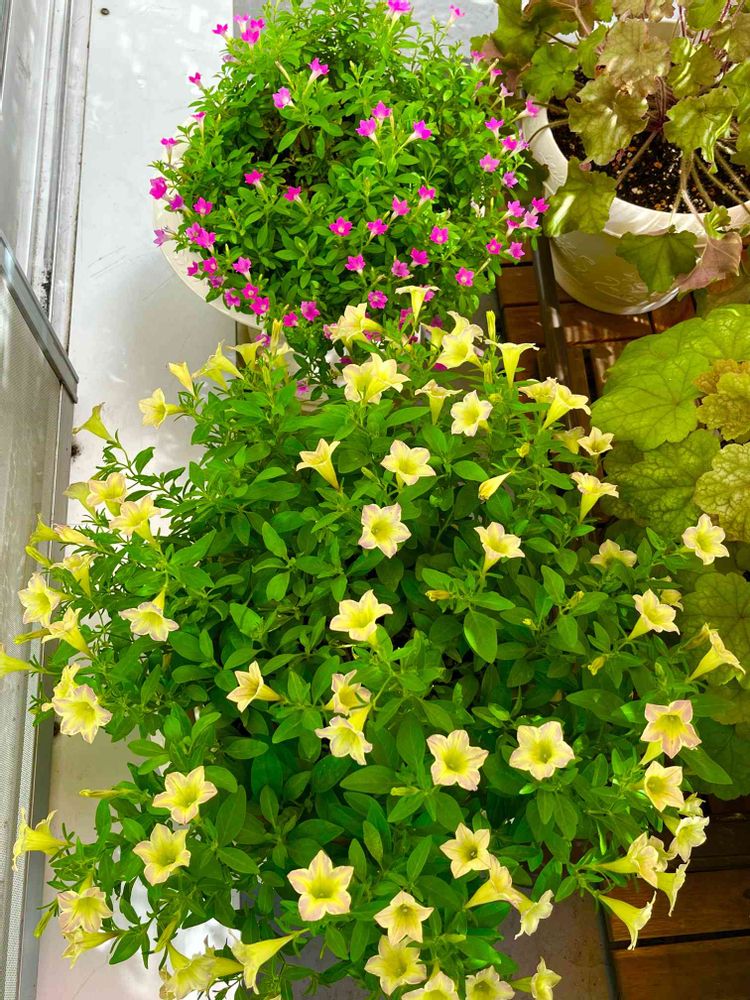 サントリーサフィニアさくらもこもこと、サフィニアアートとらネコ、だいぶ株が大きくなってきました😊昼からは、すだれで木漏れ日みたいにしています😅