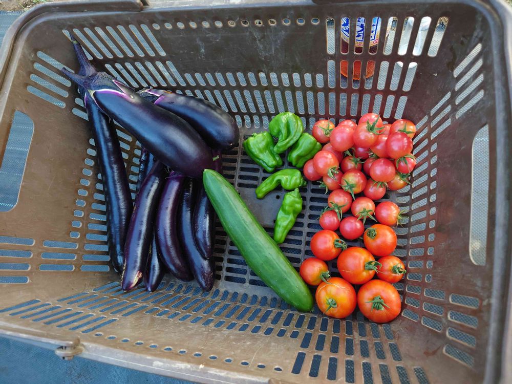 こんばんは!!今日の収穫です☀️早朝の涼しい時間に畑仕事をしているので快適です。夏野菜は毎週かなりの量が収穫できるので、食べるのも大変です。嬉しい悩みです☺️
