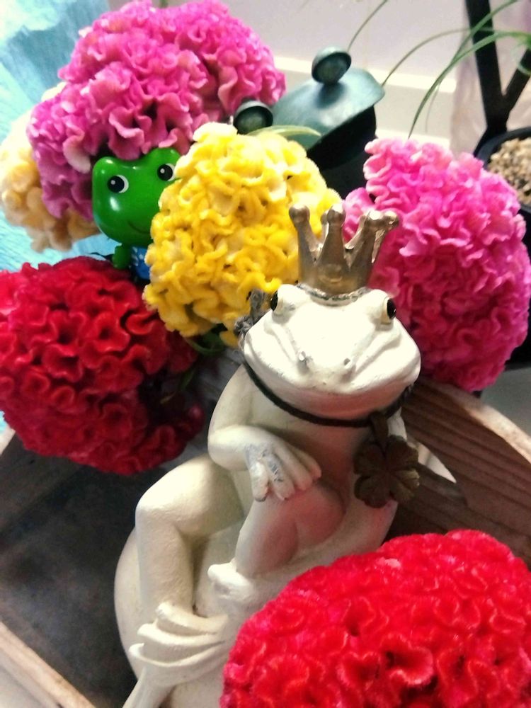 🐸さん達くつろいでますね~花の🛋で🤭🌬️🫧🫧ケイトウ(鶏頭)秋の花‥トサカゲイトウ〜見えてる部分は花序(花穂)ですね〰ケイトウの🌼NG🙅な方🙏😁