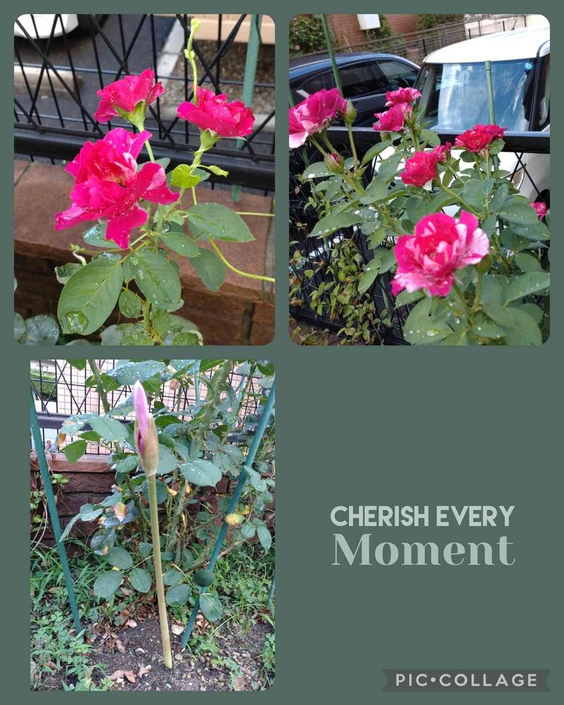 バラ モーリス・ユトリロ シュートに房咲きしています。本来シュートの先は折り取るのがいいらしいです。