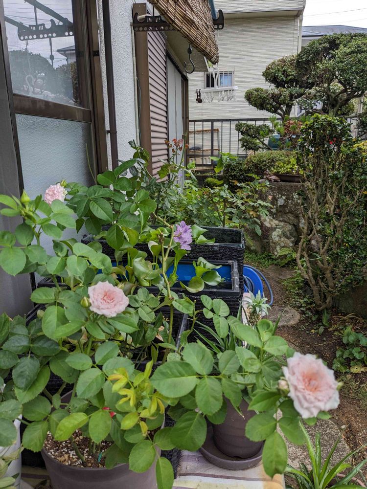 縁側の鉢植えベルちゃんローズがイキイキと次々と咲いている〜✨