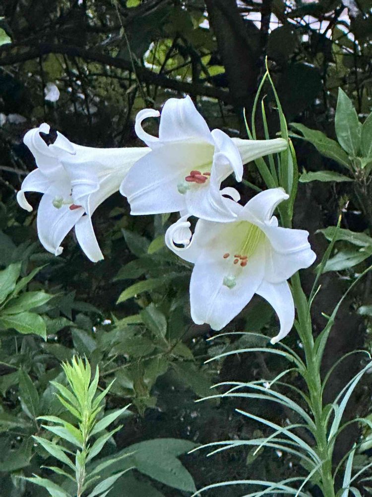 📝7日の雨上がりの朝、この写真画像はわが万葉の中庭の草木の茂みの中に、鉄砲百合の白い花が満開になって咲いて、藪庭が白く明るく輝いて百合の香りが漂っている様子でした🐶