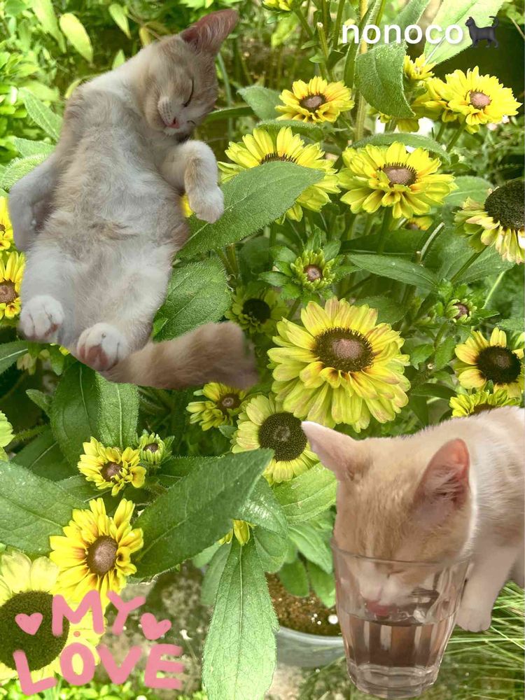 一瞬、コラージュだと分からず、本当に猫ちゃんたちがお花の中で寛いでいるのかと思ってしまいました😲✨