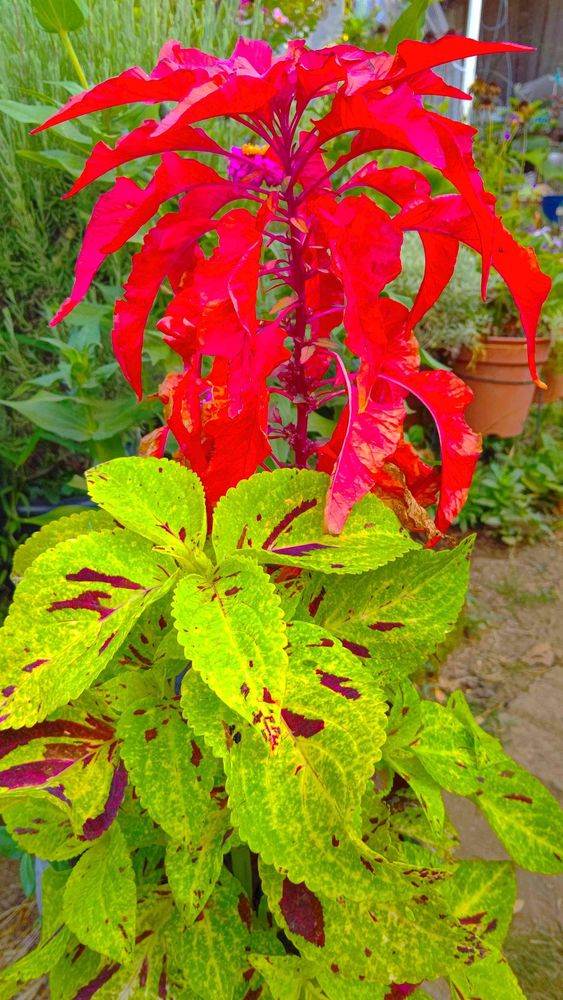 真っ赤な葉鶏頭と、緑のコリウス、秋まで、頑張って欲しい٩(ˊᗜˋ*)و