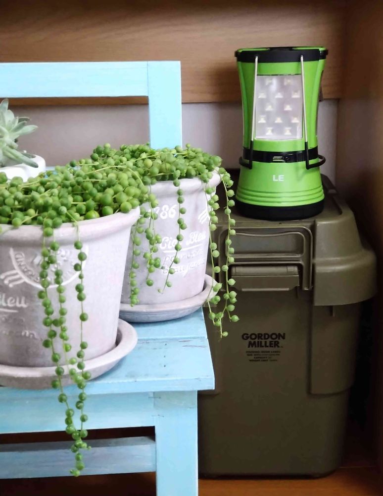 ランタン下のカーキのBOXには非常時用に日持ちのする食料を常備(ローリングストック)してます。