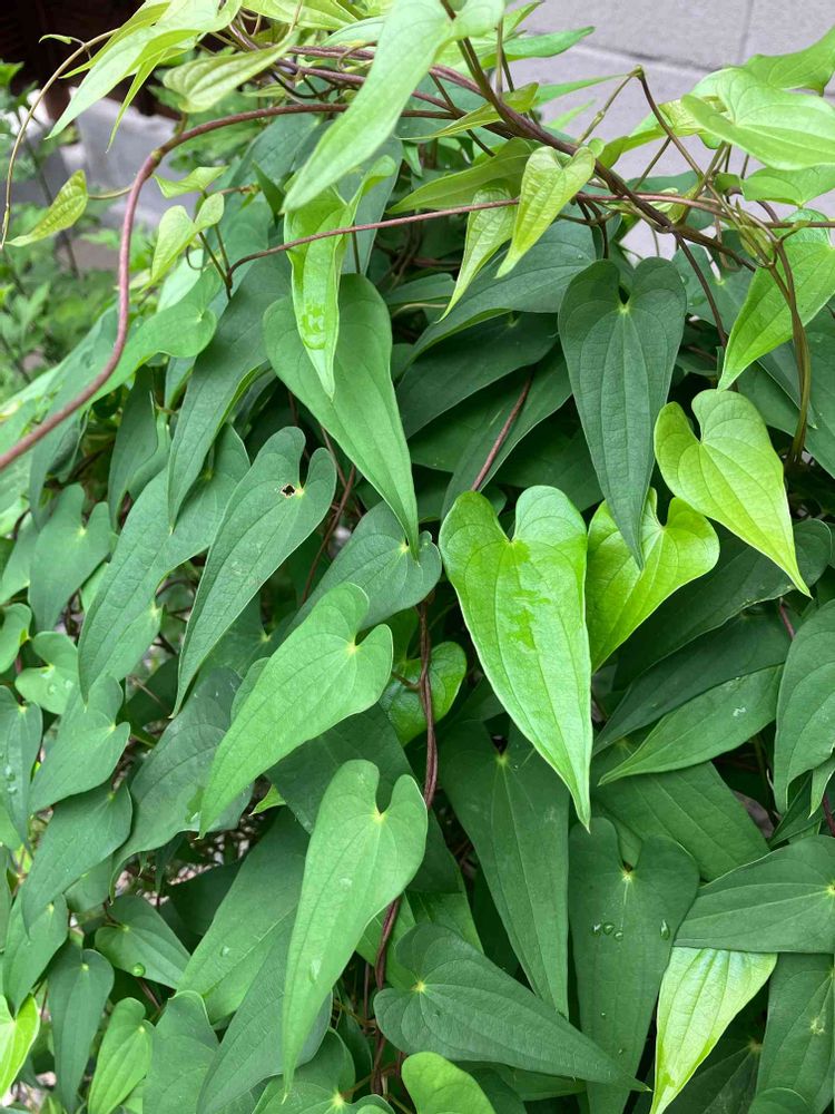 長めだけど ハート型の葉っぱがいっぱい💚💚 若葉が綺麗な山芋 植えてないけど南天をおおいます