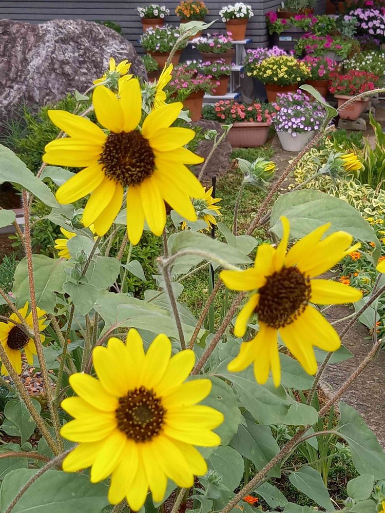 枝分かれしている向日葵、優しい感じで良いですね、後ろのお花も元気で素敵ですね(*^^*)