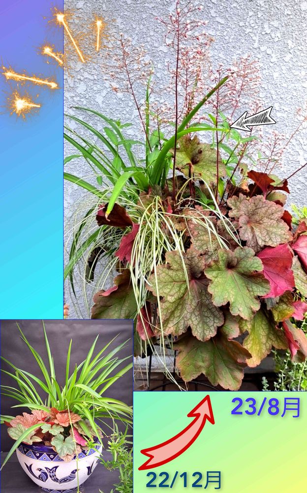 「オリヅルラン」と「ベアーグラスエバーゴールド✨️」が、暑苦しくならない様に涼しげなライン🎶