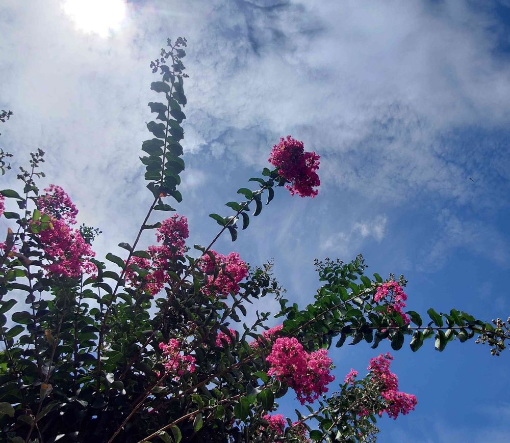 見上げて見るサルスベリを彩雲と夏の空が彩る。ー