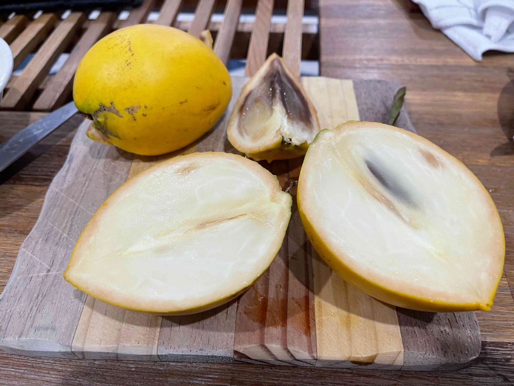 白い身を食べるとサワーソップのようなカスタードアップルのような。とにかく南国の食べ物ですね。