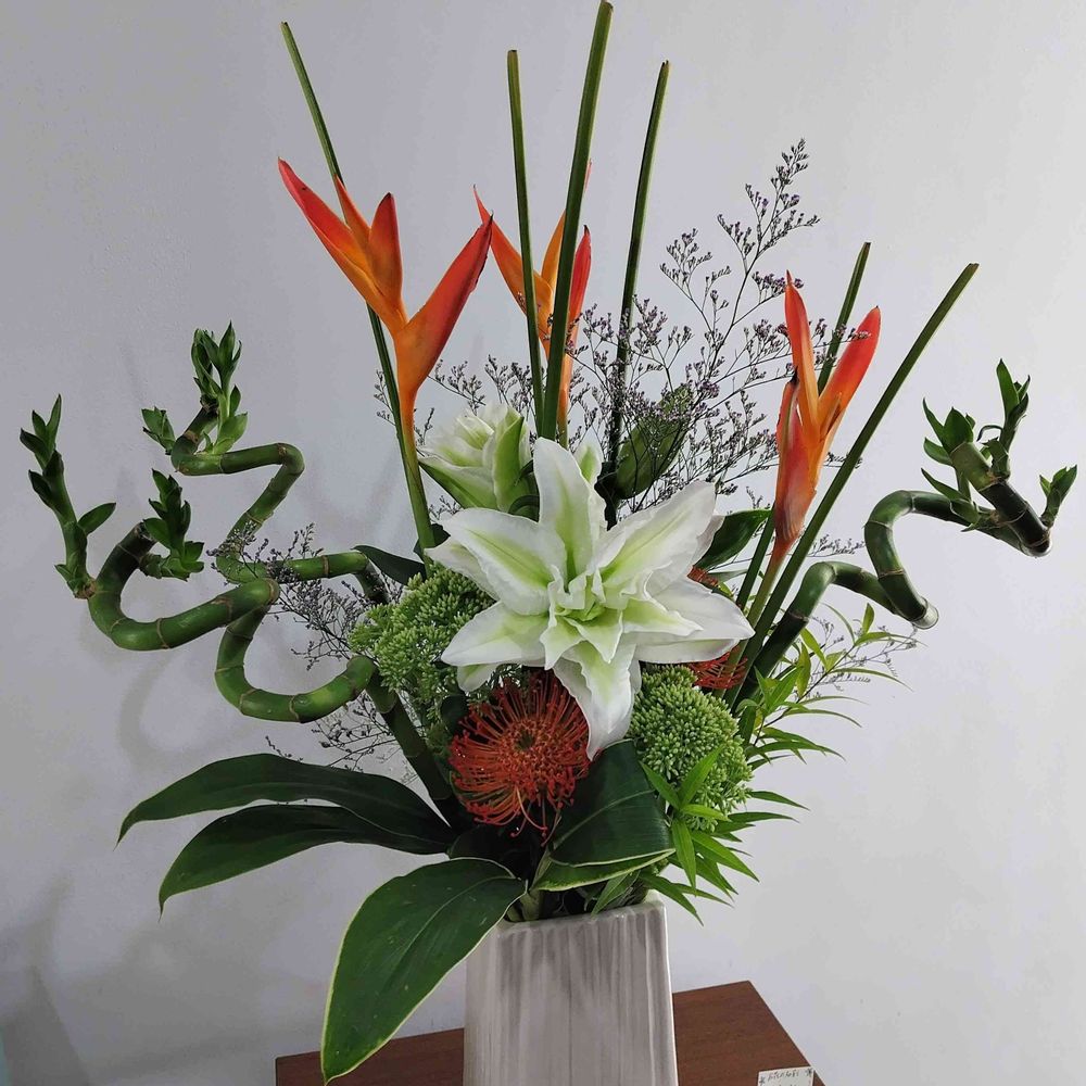 今週の花材は、バンブー、ユリ(アイシャ)、ブルーファンタジア、ピンクッション、セダム、ヘリコニア、です✨👏