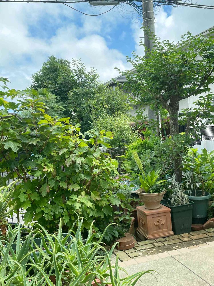 日差しがキツくなる前に アジサイやクリスマスローズなどの鉢植えをエゴノキの下に集めました。