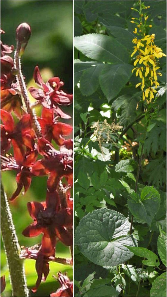 湿原縁を通る木道の山側に居た、背伸びしたメタカラコウやシュロソウ。