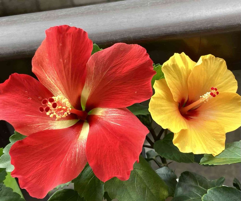 サマーブリーズ・スターリーウインドさんと、プチオレンジさん、ちょうど今朝、同時咲きしていました🤗🌺🌺