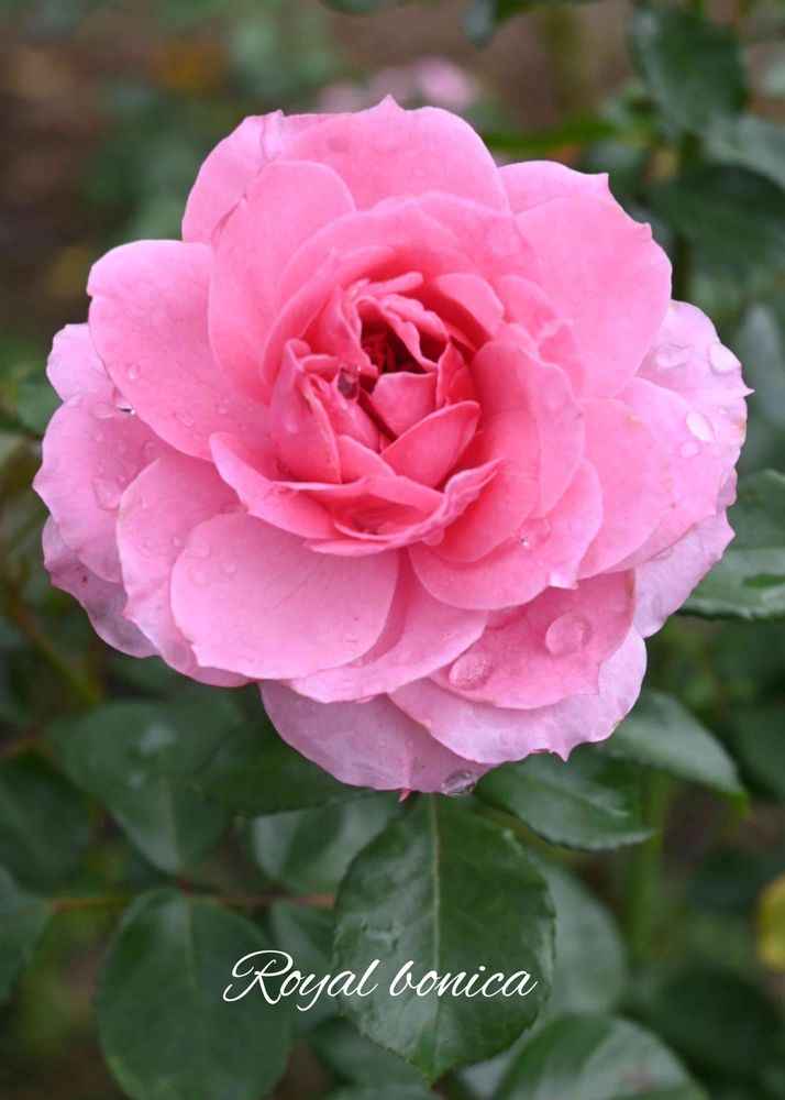 丸い形のロイヤルボニカが、雨粒を纏いコロンと咲いて可愛いです🌹🌿😍💕