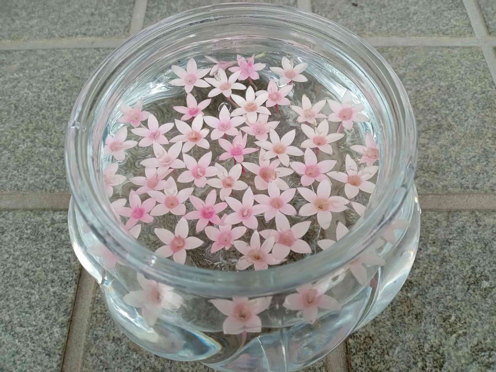 ペンタスの花がパラパラと落ちてきたので、拾って、水に浮かべてみたよ。あら、☆可愛いじゃん︎💕(笑)