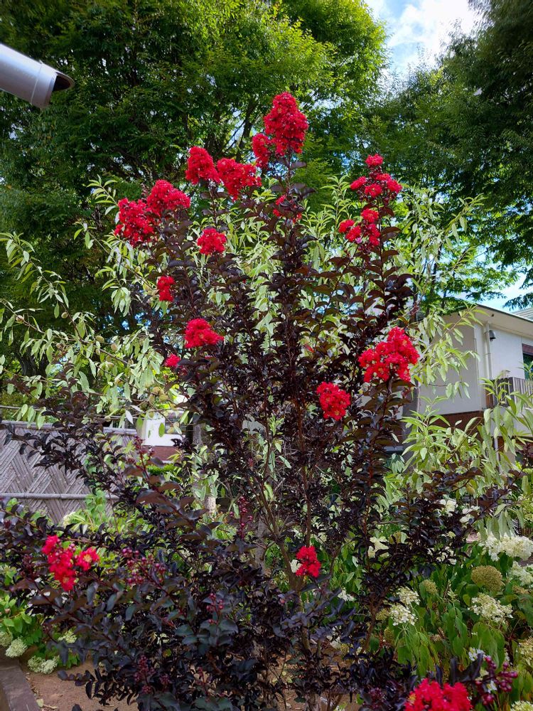 深紅のサルスベリです😮 なんとなく🪭のような形をしていますね🧐 この時期のお出かけには🪭は必携です🥵(農業試験場内にて)